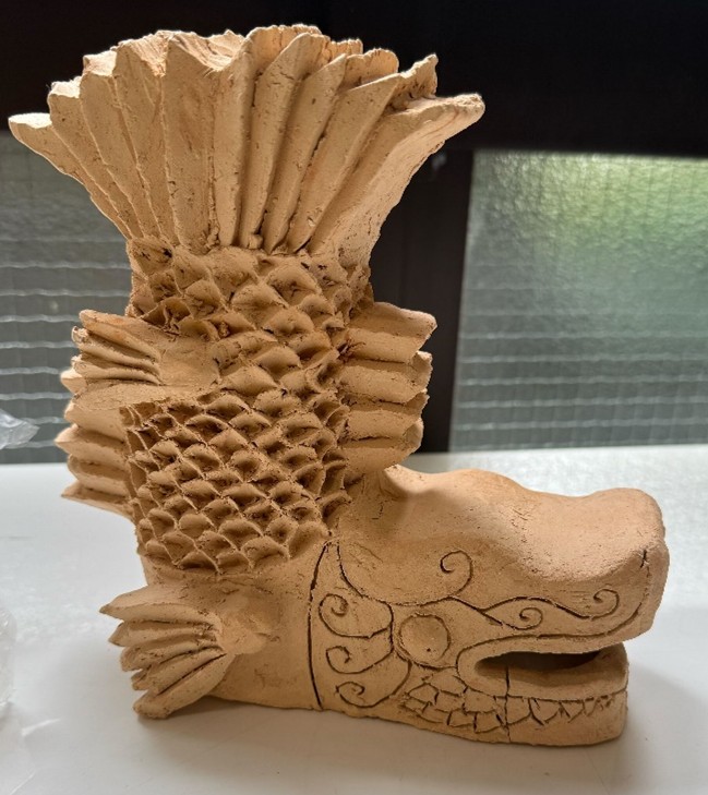 形は伝統的な想像上の生き物を思わせる力強さを持ちつつも、どこか優しさを感じさせる造形。鱗のひとつひとつ、口元の文様、全体のバランスからは、作者の繊細な観察力と根気強い制作姿勢が感じられます。